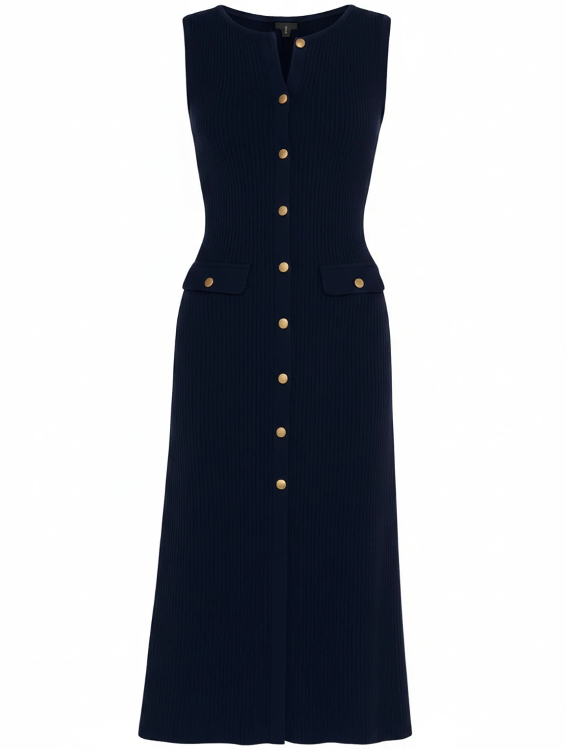 This midi dress combines timeless design with practical elements, perfect for everyday wear. The button-front detail adds a touch of vintage charm, while the sleeveless cut offers versatility for layering or warm weather. With its fitted silhouette and convenient pockets, this dress is a stylish and functional addition to any wardrobe.