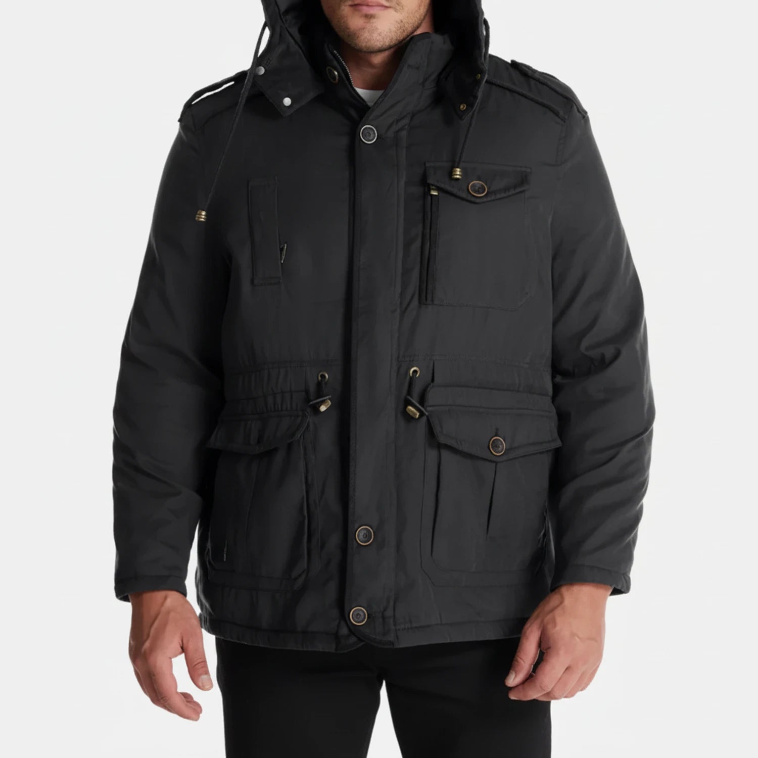 This hooded cargo jacket combines military-inspired design with practical functionality. Featuring a multitude of pockets and a drawstring waist for a custom fit, this jacket is designed for both urban adventures and outdoor excursions. The shoulder epaulettes add a touch of classic military flair, setting you apart from the crowd.