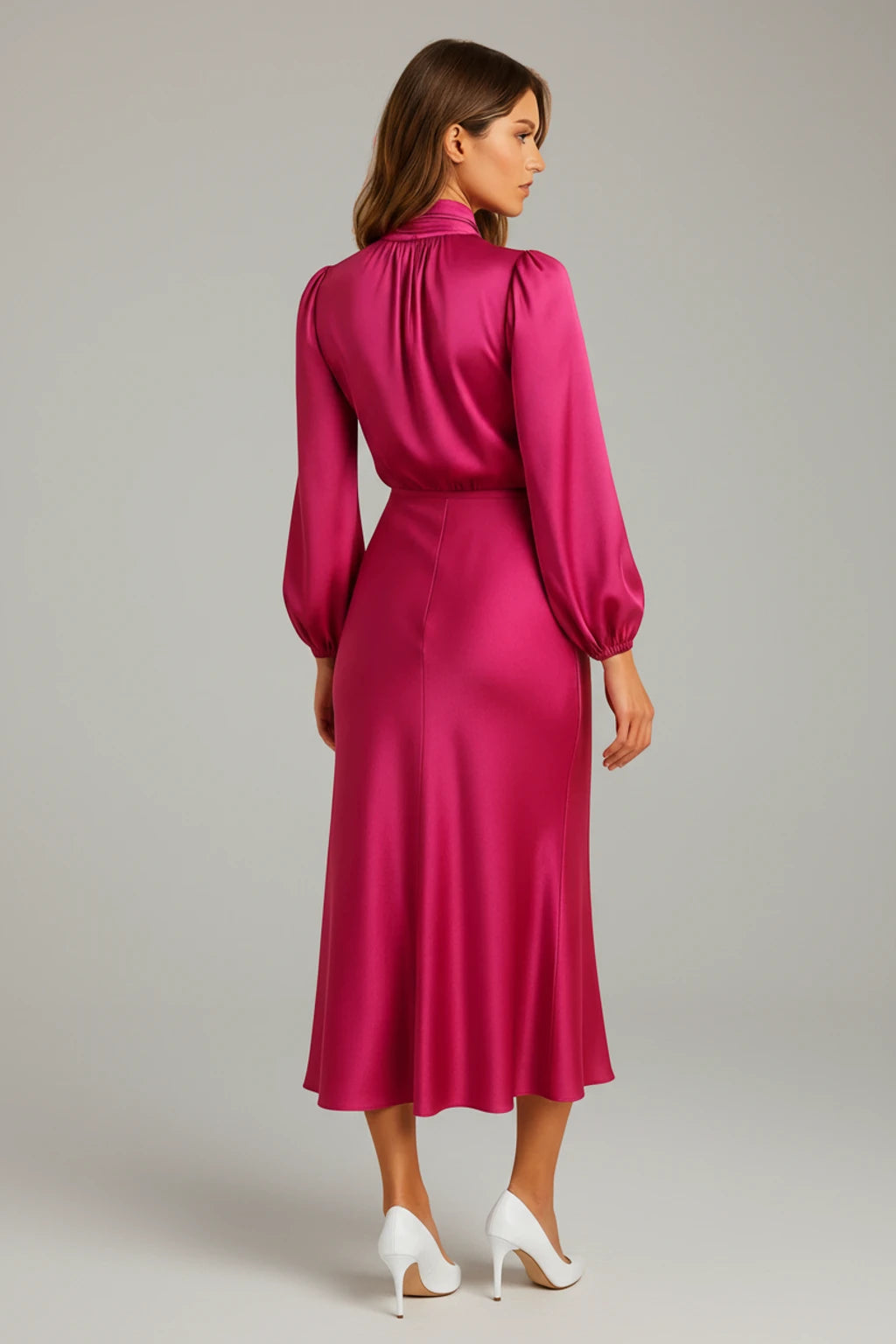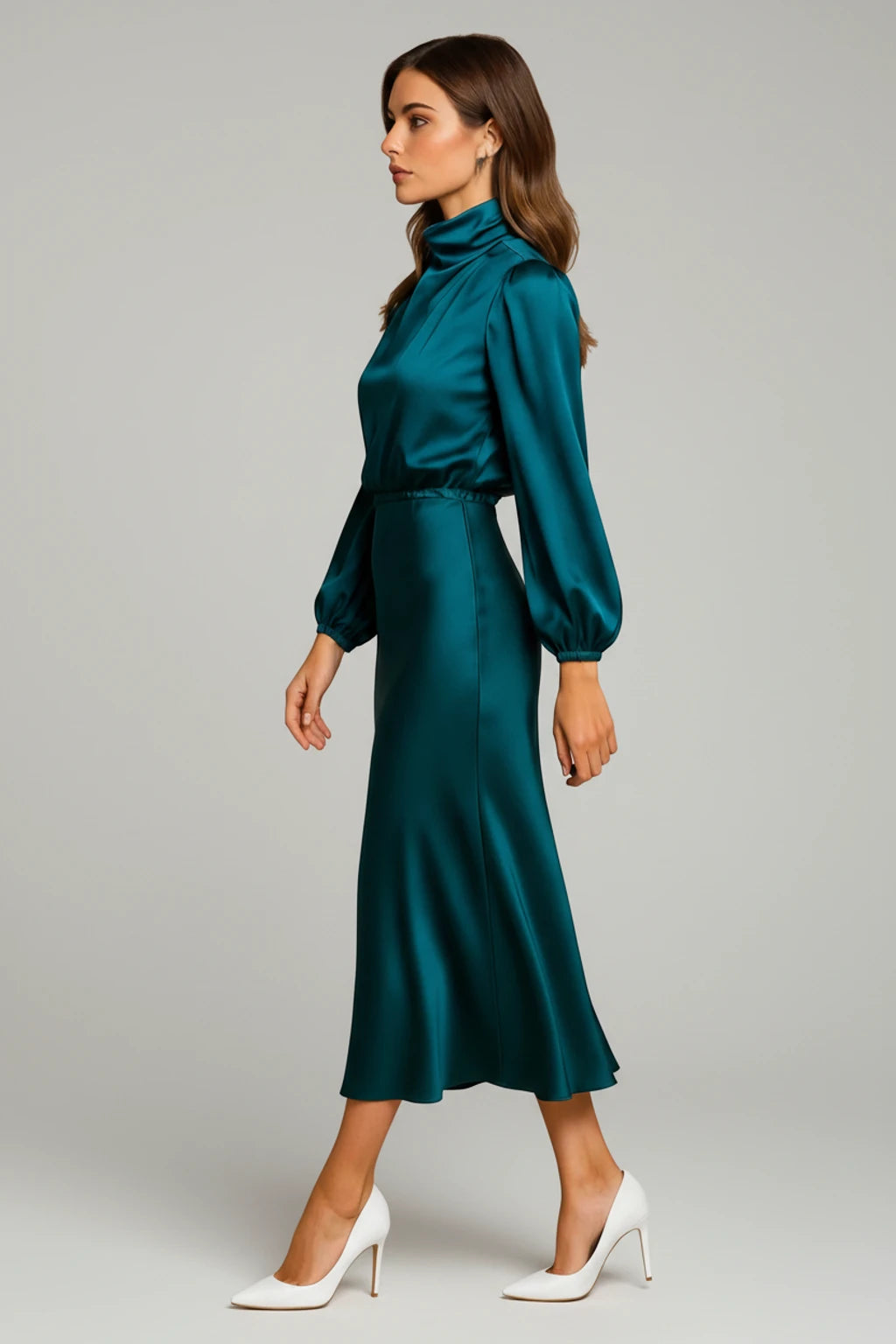 Experience timeless style with this A-line midi dress. The long sleeves and high neckline offer a sophisticated touch, while the elastic waist ensures a comfortable and flattering fit. Perfect for any occasion, this dress embodies quiet confidence and versatile elegance.