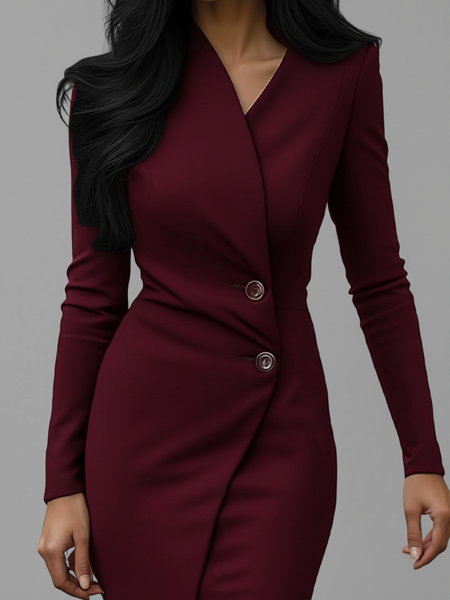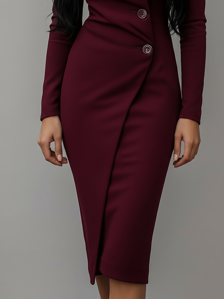 This wrap midi dress offers a refined balance of elegance and everyday wearability. Designed with a flattering V-neck and long sleeves, it creates a confident silhouette that feels both timeless and modern. The button detailing adds a touch of visual interest, making it perfect for both professional and social settings.