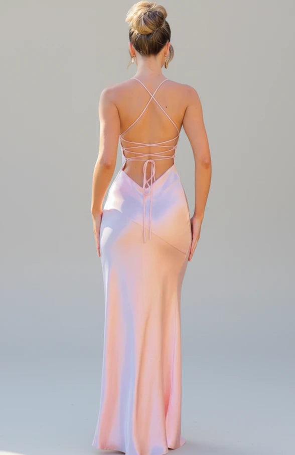 The Spaghetti Strap Maxi Dress combines elegance with a touch of allure. Featuring delicate spaghetti straps, a flattering V-neck, and a daring slit, this maxi dress is designed to make a statement. The criss-cross tie back detail adds a unique touch, ensuring you stand out at any occasion.